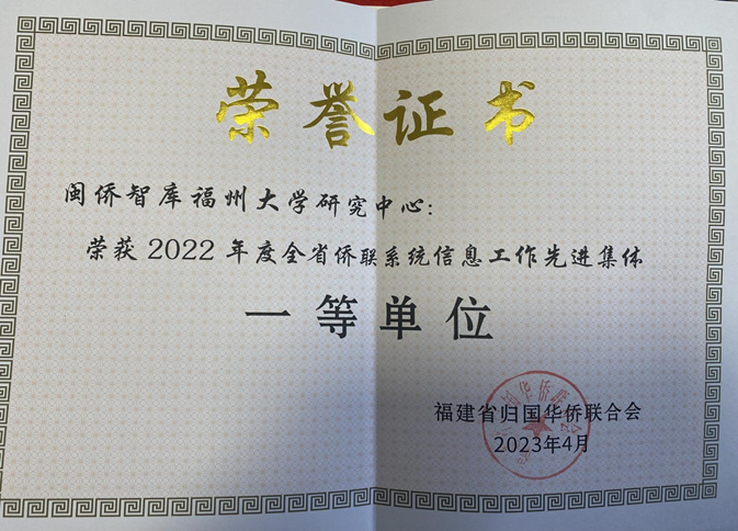 近日,福建省归国华侨联合会对2022年度全省侨联系统信息工作先进集体进行表彰,闽侨智库永利集团304am登录研究中心荣获“2022年度福建省侨联系统信息工作先进集体一等单位”。