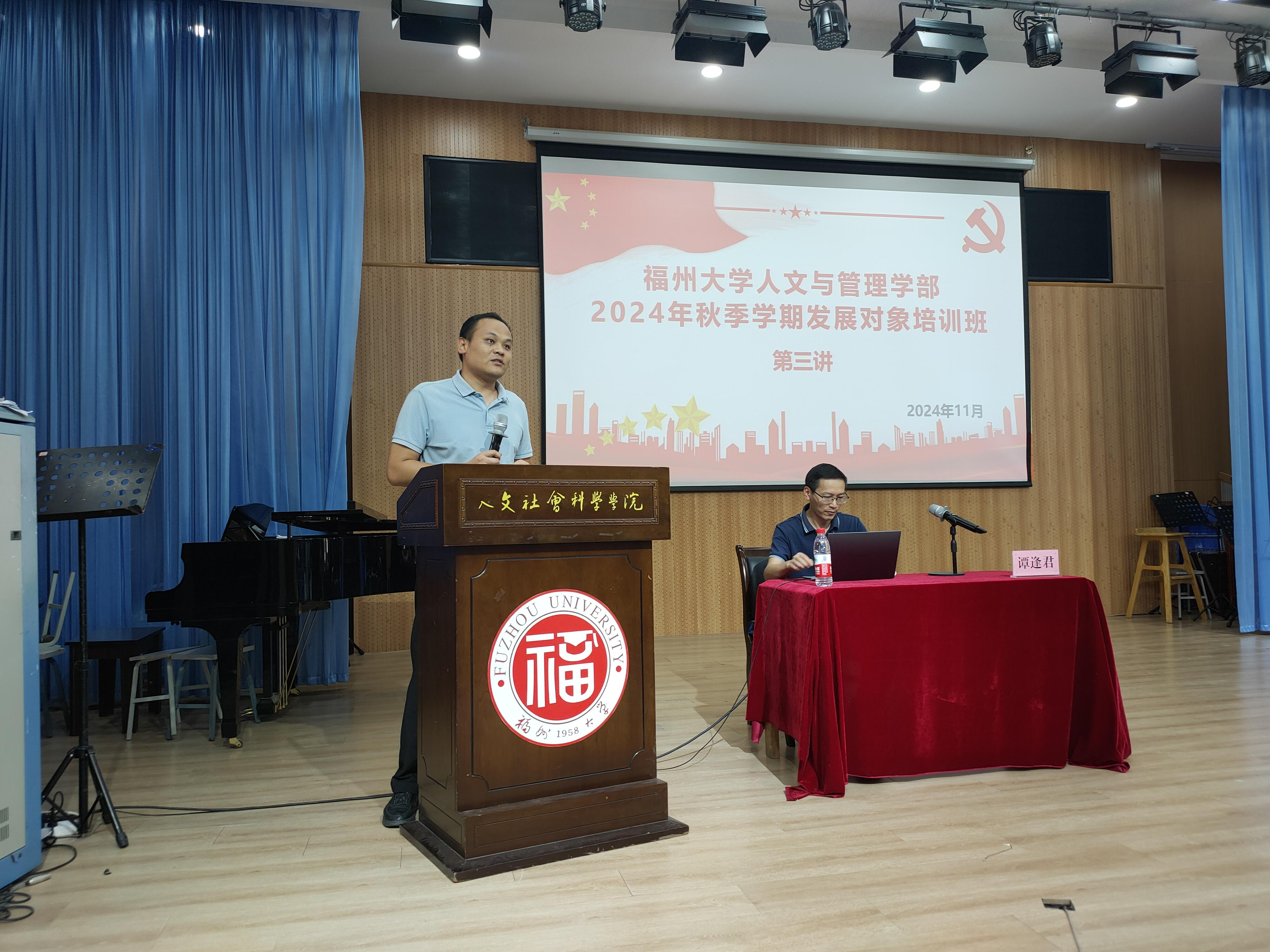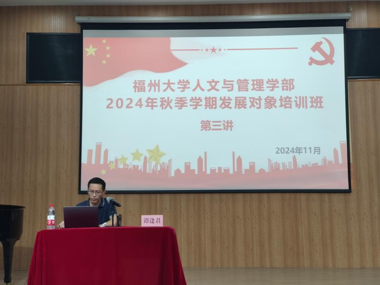 11月2日下午,永利集团304am登录人文与管理学部2024年秋季学期发展对象培训班第三讲在人文学院艺术实践基地举办,校纪委谭逢君老师作《中国共产党章程》专题讲授。人文学院团委书记齐朝阳老师主持培训。