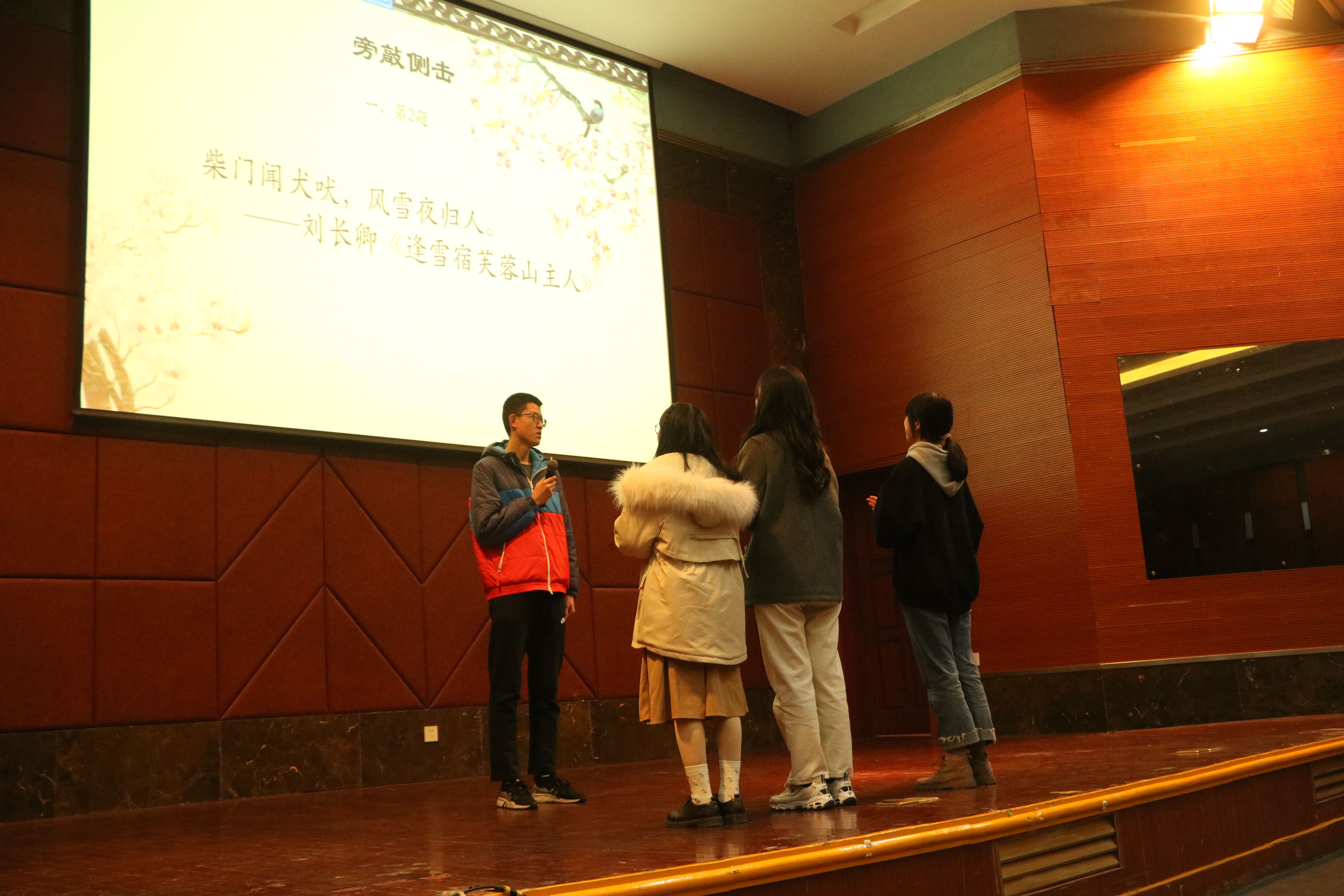 一场欢快的古典乐器合奏演出后,本次竞赛拉开了序幕,决赛由闯过初赛的六支队伍参与,分为上下两个半场,上半场活动设置了“看图猜诗”、“乱序拼诗”、“双龙戏珠”等五个环节,以多样化的方式考察选手的诗词储备量和诗词理解度,六支队伍轮番上场,风格或犀利迅速,或沉稳持重,或出其不意,皆以充分的准备展示了各自的诗词风采,赢得场下观众的阵阵喝彩。在互动环节,场下观众踊跃上台体验诗词游戏,现场气氛热烈。