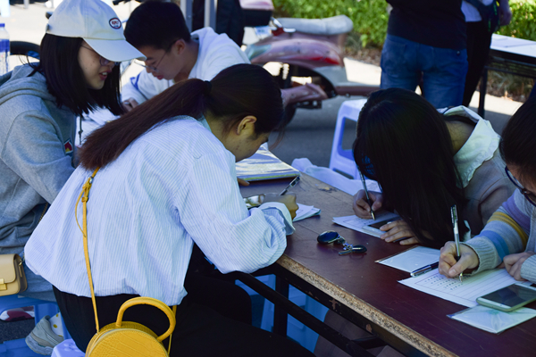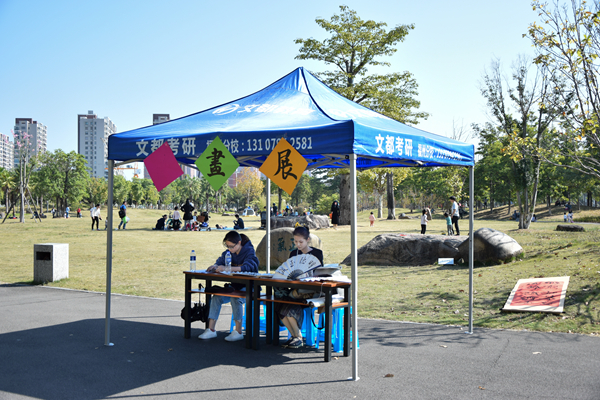 活动现场还提供毛笔与墨水进行进行现场书画创作,虽然参与书画创作的同学对毛笔的使用不太熟练,但他们仍旧乐在其中,创作属于自己的书画作品。在誊抄比赛中,现场成员需要用硬笔在竖格纸上誊写经典古诗文作品。有在场同学表示,由于智能手机、电脑的普及,自己已经很久没有练字了,这次誊抄比赛对我而言是一个小小的考验。