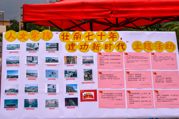 活动现场展示了献礼中国三行情诗的优秀作品及以“领略壮丽山河,我和祖国合影”为主题的优秀摄影作品,本次活动于一诗一画中凝聚了人文学院莘莘学子对祖国的祝福与深情。本次活动最精彩的环节是现场贴画环节,到场的同学们亲手用五谷杂粮绘制美丽的图画,以五谷为作画材料,含有"五谷丰登"的美好寓意,一幅幅画作,一张张笑脸,无不展现同学们的热情。同学们都情绪高涨,搭配色彩,仔细粘贴,现场一片欢声笑语。此外本次活动还有绘画环节,同学们手持五彩水笔,在纸上随心涂绘,色彩在这里碰撞,创意在这里激荡,产生奇异的效果,现场气氛达到了高潮。