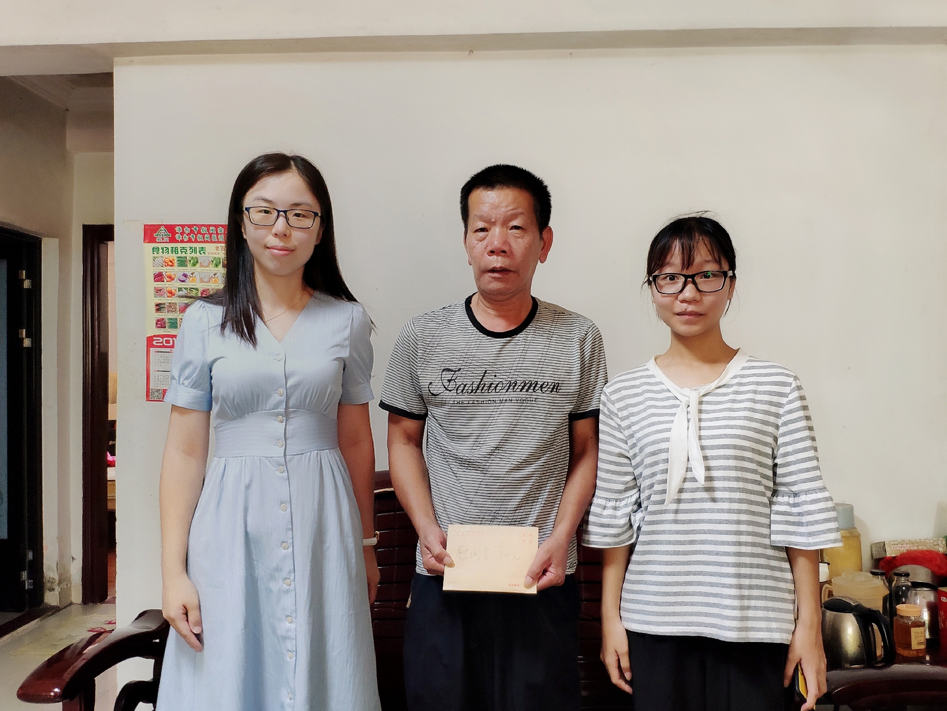 房菁辅导员与林雅莹同学及其家长合影并送上慰问金