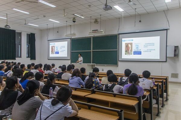郑志刚副书记从问题“一流大学的价值何在、一流教育的灵魂何在”展开讲述,通过举例分析西方教育的特征,让同学们意识到在大学中找准自身定位并学会自我反思的重要性。郑志刚副书记通过分析我国当前大学生的整体人文素质情况、科研工作依然有所落后的现实,提醒同学们要以中国特色社会主义指导思想为指向标,不忘根植民族主义,树立正确的大学生三观。此外,郑志刚副书记回忆起当年阅读《党章》时的那份震撼与感动,鼓励同学们阅读《党章》,从而理解将科学社会主义作为指导的重要性和必然性。讲座即将进入尾声,郑志刚副书记期许同学们在大学生活中健康生活,做一个德艺双兴,心灵美、气质美、仪表美的优秀大学生。