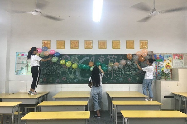 路途遥远,却阻挡不了队员们对失依儿童们的关心;旅途疲惫,也掩盖不住队员们支教的热情。经过3个小时的车程,实践队顺利到达江阴镇,并受到当地政府的热情接待。在与当地镇政府简短对接后,实践队全体成员顾不上身体的疲惫,立即赶往浔头小学,开始支教前的准备工作,他们用气球等装饰品精心装饰教室,希望为儿童们布置一个温馨欢乐的教室。
