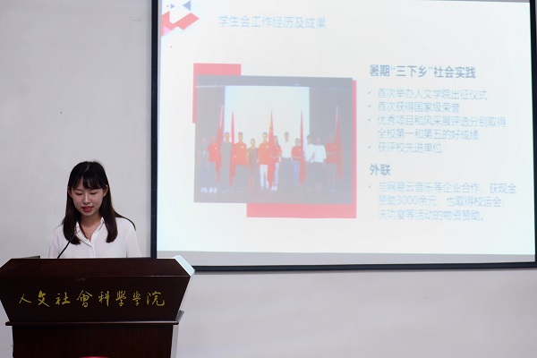 本次换届竞选大会分为竞职演说与现场答辩两个环节,最终由老师和观众评审投票选出前6名候选人组成新一届主席团。每个参与竞职演说的同学都表现得自信沉稳,以良好的风貌展现自我;他们演说的内容涉及各个方面——在学生会和班级的工作贡献、对部门工作的认识及工作计划、个人优点……演说环节可见各位候选人的用心准备程度,答辩环节则考验了他们各自的应变能力。答辩环节采取随机抽取问题的方式,由选手对问题进行观点陈述。各位选手沉着淡定,富有逻辑,细致地阐述了对所提问题的看法,为其他学生会干事起到了很好的榜样作用,大家纷纷鼓掌表示佩服。