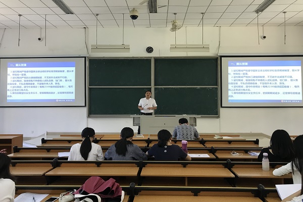 会议伊始,人文学院团委副书记齐朝阳老师向同学们交代暑期留校应该注意的安全事项,强调暑期留校期间应严格遵守国家法律法规和学校各项规章制度,服从学校、学院统一管理。同时需要注意防盗、防骗、防交通事故,保障人身财产安全;不私自到水塘、河流等地游泳玩耍;要关注天气变化,做好准备与预防;在宿舍楼不得使用违禁电器,应做到人走时关闭宿舍内各类电源开关及插座,确保不发生火灾及火险事故等。紧接着人文学院党委副书记郑志刚老师上台讲话,提醒各位同学在注意安全之余,要珍惜此次暑期留校机会,服从学校管理,从而更好的准备考研、实习、社会实践等。