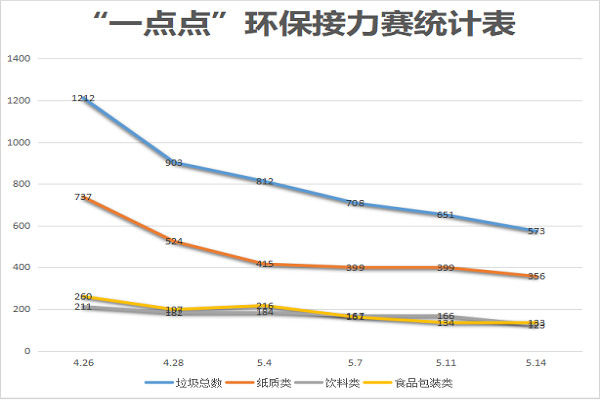 该活动历时三周,志愿者们共清理垃圾近5000件,在志愿者们进行第一次志愿活动时收集的纸质类垃圾共737件,饮料类垃圾211件,食品包装类垃圾260件,数目惊人。但从垃圾数量统计表来看,随着活动的深入开展,清理的垃圾数量呈下降趋势,表明了同学们的环保意识也正如期望的那样不断得到增强。在清理课桌过程中,志愿者们常常遇见保洁阿姨们,他们对同学们的行动高度赞许。志愿者们也表示,自己受到表扬,又带动了同学们养成良好的习惯,收获了满满的成就感。