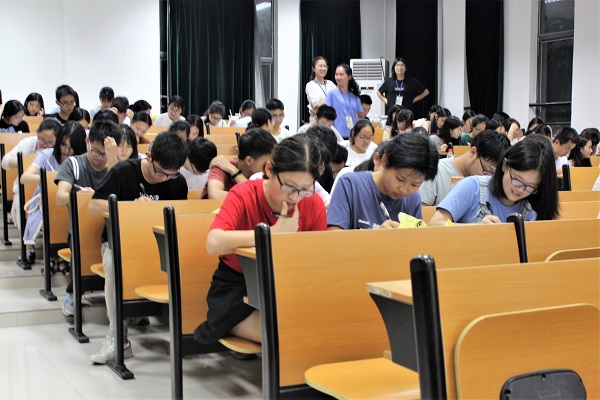 第一轮线上的比拼海选出了众多爱好文学兼具文学功底的同学。他们集聚一堂,通过现场笔试就中国诗词的人文知识一较高下。为保证比赛公平性,主持人刘燕芬强调了诚信考试的要求,通过工作人员分发袋子暂时保管参赛选手手机,降低其使用电子设备作弊的可能性。考试过程中,同组队员轻声积极讨论,奋笔疾书,为取得一个好成绩而奋斗,团队精神在一场小小的考试中发挥得淋漓尽致。