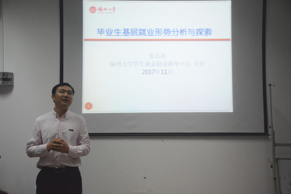 11月10日晚6点30分,由福大就业中心主任张志忠老师主讲的“毕业生基层就业形势分析与探索”讲座在人文学院院办102顺利开展。人文学院党委郑志刚副书记、人文学院团委叶阁泽书记、人文学院团委罗奕帆副书记、2015级辅导员王薇薇出席此次讲座。