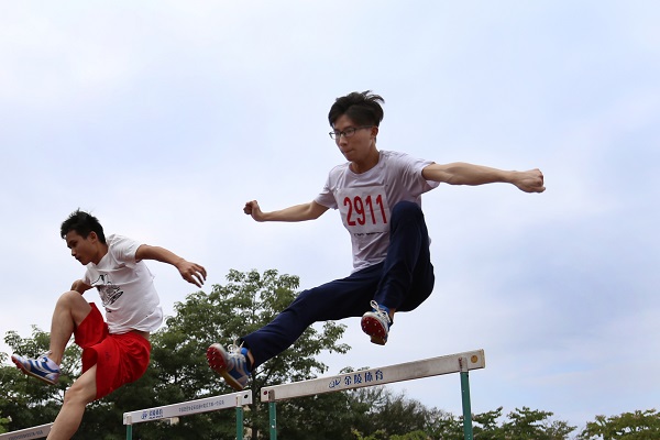 面对前方的横栏,严星麟毫不畏惧,在发令枪响的余声中飞奔而出,抬腿,跨步,纵身一跃,便跨栏而过。在加油与欢呼声中,严星麟跨过一个又一个的横栏,每一次跨步,每一次跃栏都展示着人文学子的力量与必胜的决心。