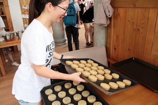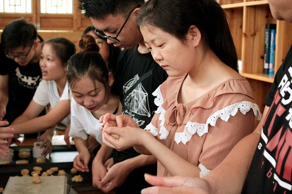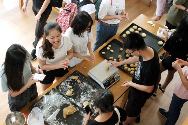 走进福友阁,映入眼帘的是桌子上新鲜的月饼馅和各式各样的工具。“将面皮搓圆后摊平,然后把馅儿放在中间,以食指和拇指的力量慢慢向上收口……”同学们按照志愿者的引导边学边做,有说有笑,互相交流,不一会儿,一个个精美的月饼就成型了。同学们看着自己做成的第一个月饼,变得更有信心,又兴致勃勃的继续投入制作。烤好的月饼传出的香甜的味道营造出浓浓的中秋节日氛围。汉语言文学16级的黄同学说:“以前的月饼都是买着吃,现在能在一块儿动手亲自做月饼,吃起来也是别有一番滋味。”