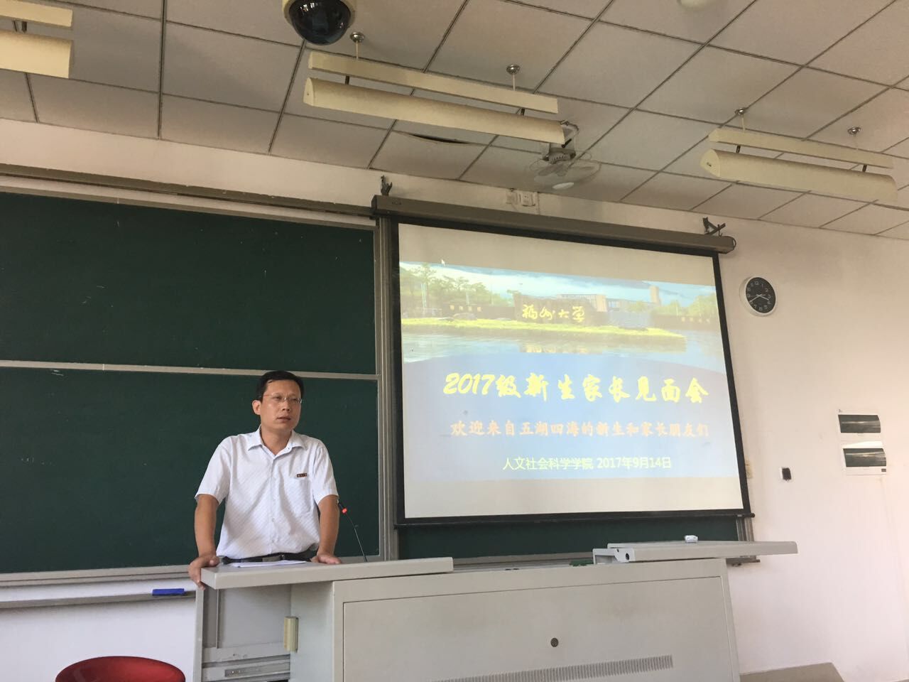 新生家长在迎新志愿者的带领下参观校园,志愿者热情地向家长们介绍着福大的校园文化建设,即使烈日炎炎,家长们依旧兴致不减,不时停下脚步拍照留念。抵达教室后,罗奕帆老师对新生家长表示欢迎,向各位家长介绍了学校的相关事宜,并表达了对2017级新生的关怀,希望2017级新生能够自立自强。郑志刚副书记则为各位家长详细的介绍了永利集团304am登录的基本情况,内容包括人文学院优秀的师资力量,完善的硬件设备等。郑志刚副书记更从学科课程、就业方向等各个方面对人文学院的四个专业——汉语言文学专业、社会学专业、应用心理学专业、音乐学专业,进行深入分析。此外,郑志刚副书记对新生家长们提出建议:“在生活方面,家长们应该鼓励孩子积极迎接新挑战,适应大学新生活。在学习方面,家长们应该鼓励和支持孩子继续深造。”