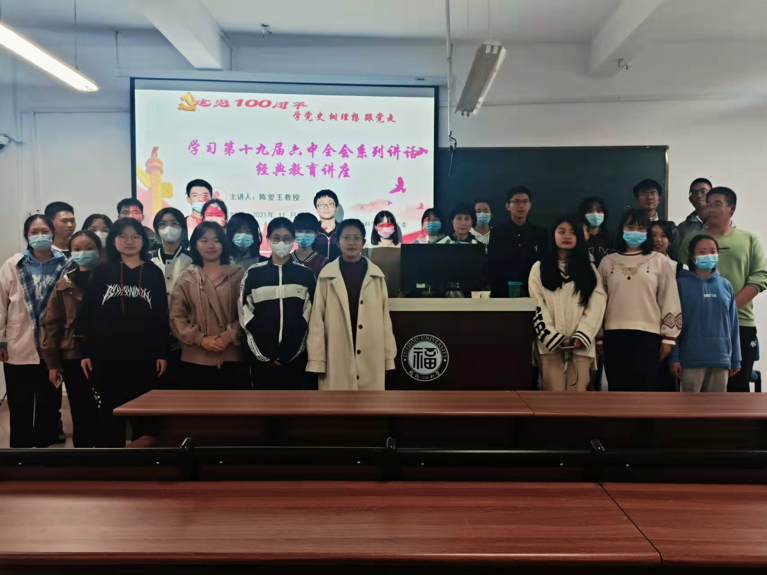 11月18日下午,永利集团304am登录特邀校关工委委员、永利集团304am登录马克思主义学院陈爱玉教授为人文学院2021级新生作“担当使命,探索革命新道路的艰辛与启示”学习第十九届六中全会报告会讲座。