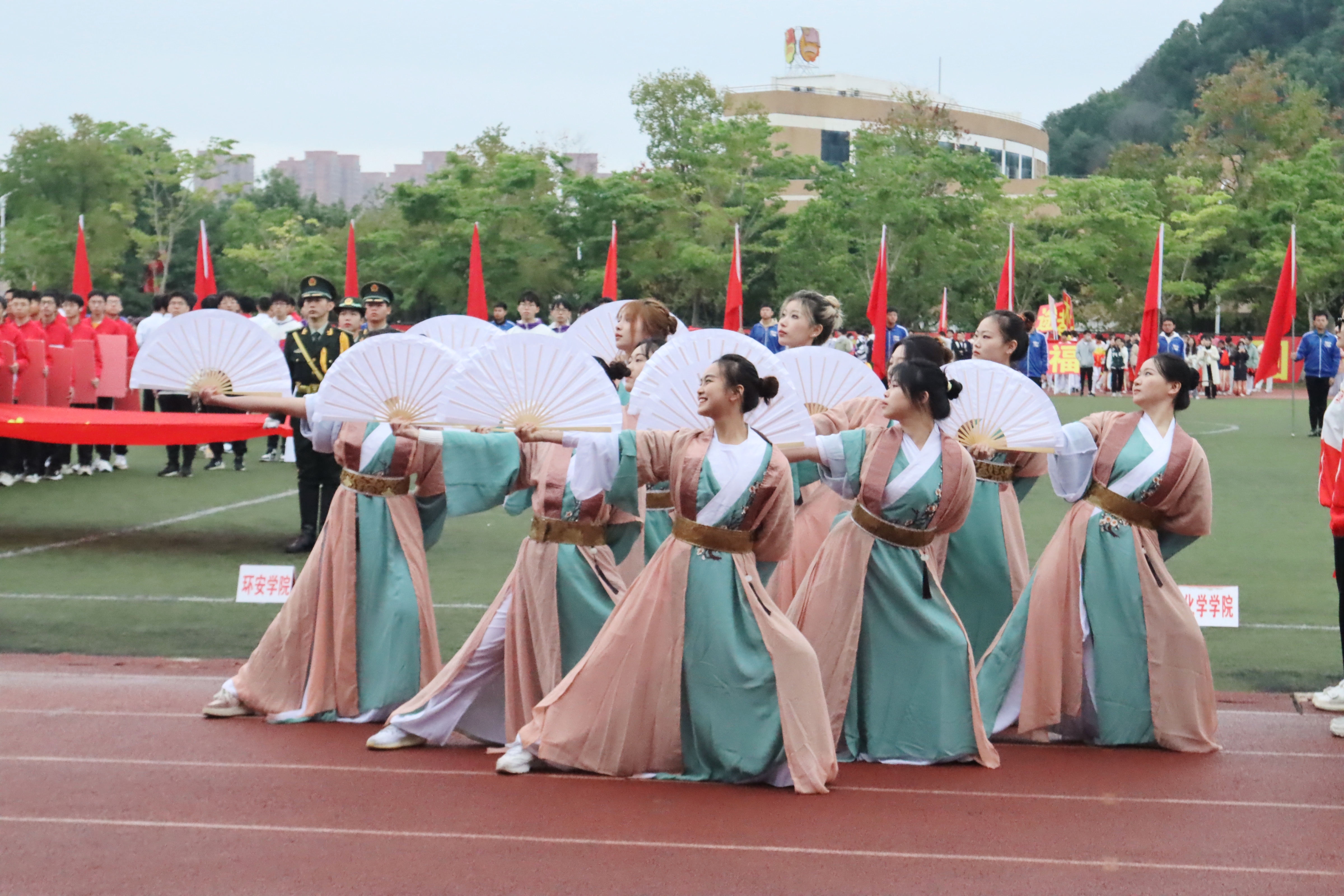 行至主席台前,汉服队员丝毫不显拖沓,长袖长裙踏出一身英气;运动员踏步而行,青春热情洋溢博得阵阵喝彩。轻歌抚人,扇舞动人,人文学院的扇子舞节目表演全场瞩目。音乐轻柔,曲调满含悠扬文韵;身姿婀娜,白袖尽显国风之美。队列变换,舞姿柔美,身姿交错,小扇轻摇,舞蹈表演赢得热烈掌声。一曲舞毕,方阵队员在“人文学院礼赞二十大”的口号中为表演画上完美句号。